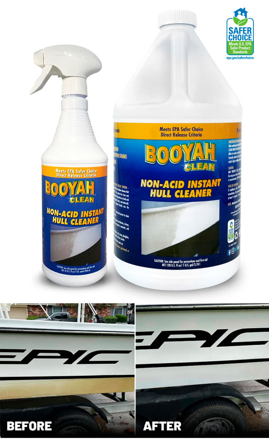 Cleans the Dirtiest of Hulls, Removes Water and Scum Lines, Fish Blood and Tannin Stains. Will Not Damage Trailers (Aluminum, Galvanized, or Painted).